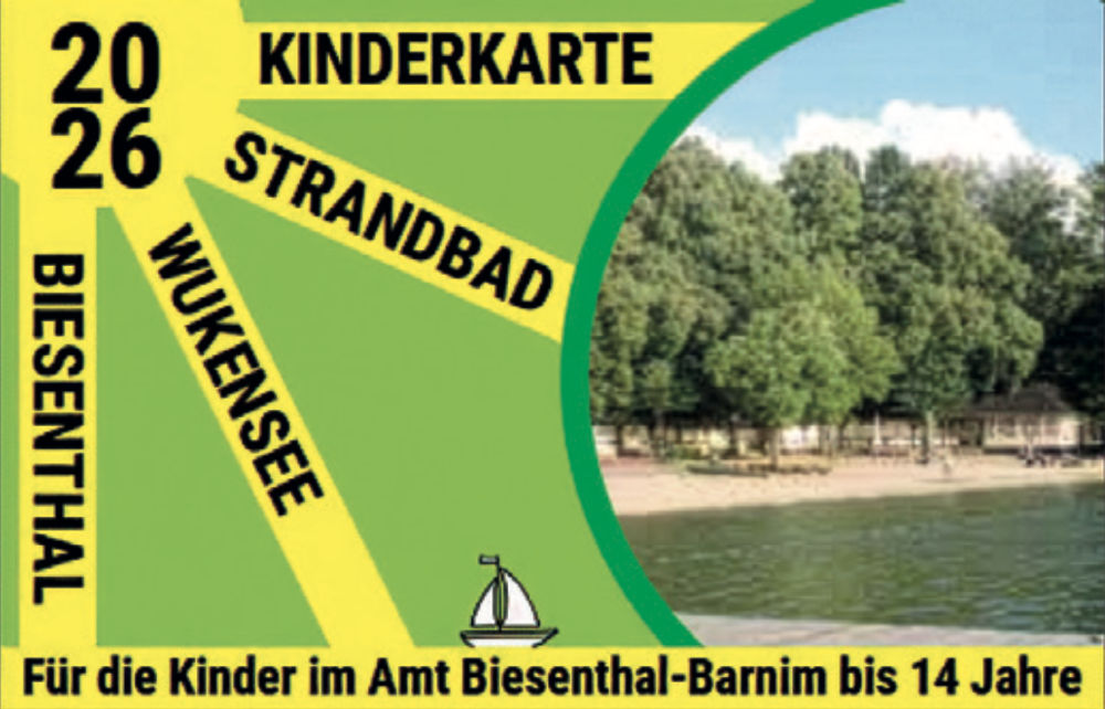 Auch im Sommer 2026 erhalten die Kinder im Amt Biesenthal-Barnim kostenfreien Eintritt in das Strandbad Wukensee. Kinder bis einschließlich 4 Jahre haben generell freien Eintritt. Für Biesenthaler Kinder ab 5 Jahren sind ab sofort die Kinderkarten für den freien Eintritt in das Strandbad Wukensee in der Amtsverwaltung sowie in den Kitas, den Schulen, dem Hort und im Rathaus erhältlich.