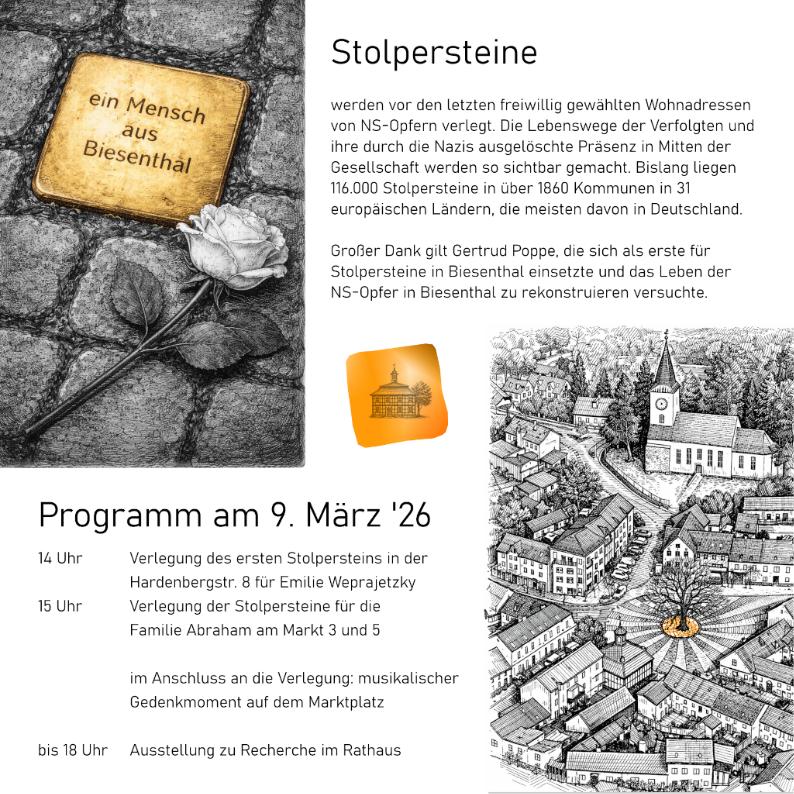 Die Verlegung der Stolpersteine am 9. März 2026 beginnt um 14 Uhr in der Hardenbergstraße 8 mit dem Stein für Emilie Weprajetzky. Danach folgt um 15 Uhr die Verlegung für Leo, Johanna, Günther und Helga Abraham und Ernestine Schoeps vor der Apotheke am Markt 5 und für Toni (Sidonie) Abraham Am Markt 3. Im Anschluss gibt es einen musikalischen Gedenkmoment am Marktplatz und die Möglichkeit eine kleine Ausstellung zu den NS-Opfern aus Biesenthal im Rathaus zu besichtigen.