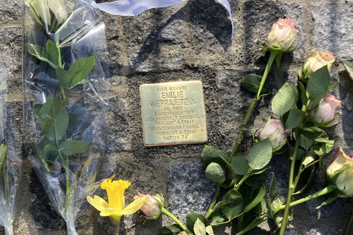 Danach stellte Elliot Müller die historischen Hintergründe vor und zeichnete die Lebensgeschichte von Emilie Weprajetzky nach. Sie wurde 1892 in der Hellmühle bei Biesenthal geboren und verbrachte den größten Teil ihres Lebens in unserer Stadt. Aufgrund einer Behinderung wurde sie von den Nationalsozialisten als sogenannt „lebensunwert“ eingestuft. Nach einer Zwangssterilisation wurde sie 1939 in die Landesanstalt Eberswalde eingewiesen und im Juli 1940 in die NS-Tötungsanstalt Brandenburg an der Havel gebracht, wo sie ermordet wurde.