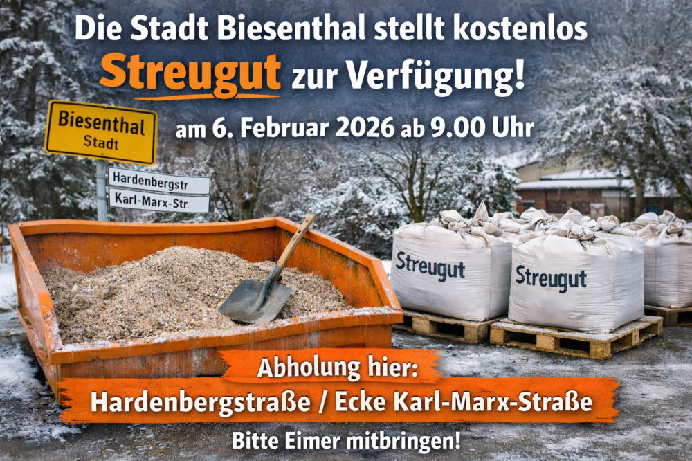 Die Stadt Biesenthal stellt allen Bürgerinnen und Bürgern am Freitag, 6. Februar 2026, ab 9.00 Uhr kostenlos Streugut zur Verfügung.