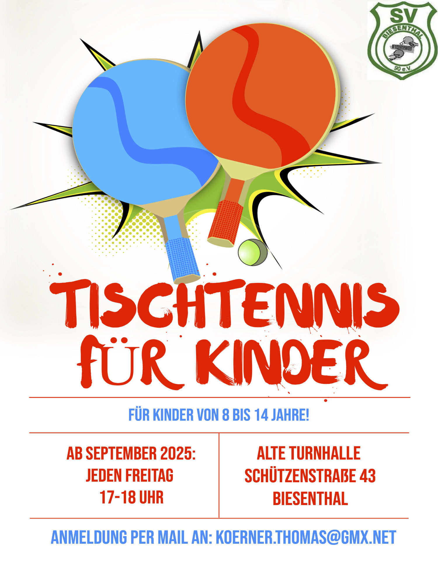 Ab September 2025 erweitert der SV Biesenthal 90 e.V. sein Sportangebot um ein regelmäßiges Tischtennis-Training für Kinder im Alter von 8 bis 14 Jahren. Jeden Freitag von 17 bis 18 Uhr öffnet die Alte Turnhalle (Schützenstraße 43) ihre Türen für alle, die Lust auf die schnellste Rückschlagsportart der Welt haben.