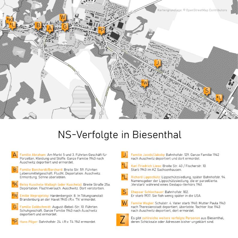 Für die Verlegung von Stolpersteinen in Biesenthal hat sich zuerst die Stadthistorikerin Gertrud Poppe eingesetzt. Sie hat auch als erste versucht das Schicksal der NS-Opfer in unserer Stadt aufzuklären und zu dokumentieren. Diese Arbeit wird jetzt von einer kleinen Initiative fortgeführt, die sich über Interesse freut und gerne ihre Rechercheergebnisse mit anderen teilt.