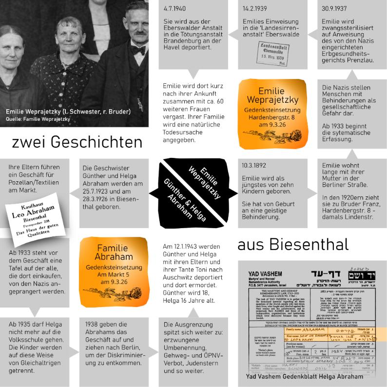 Emilie Weprajetzky wurde am 10. März 1892 in Biesenthal geboren. Sie hatte ab Geburt eine wahrscheinlich geistige Behinderung und war das jüngste von zehn Kindern. Sie wurde auf der Hellmühle geboren, lebte lange mit ihrer Mutter in der Berliner Straße und möglicherweise zeitweilig in der Grünstraße, später zogen beide zu ihrem ältesten Bruder Franz in die Hardenbergstraße 8 (damals Lindenstraße).