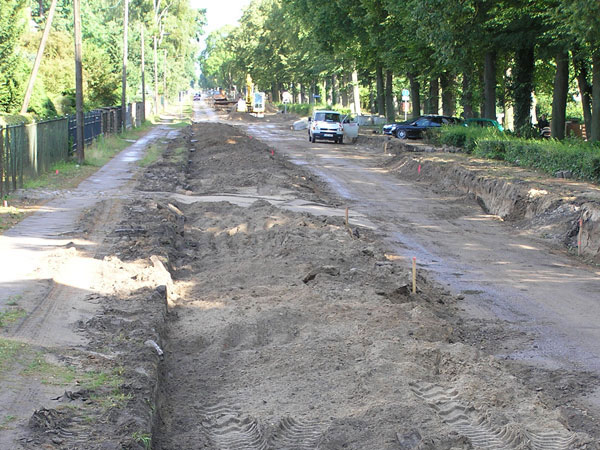 Aber nun kann ab Montag in diesem Bereich etwas nachgeholt werden, was in den übrigen Bereichen der Bahnhofstraße schon beinahe vergessen ist: das Verlegen der Abwasserleitung. Sie wird flacher liegen als der Regenwasserkanal und daher bald die Parkstraße erreichen. Dann kann der Straßenaufbau ersteinmal zwischen Buchenallee und Parkstraße ohne Einschränkungen in voller Breite weitergehen. Unvermeidlichen zusätzlichen Aufwand macht die Gewährleistung der Zufahrt zu den Grundstücken (Bild 1).