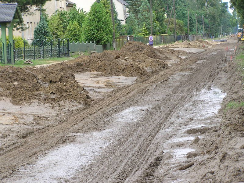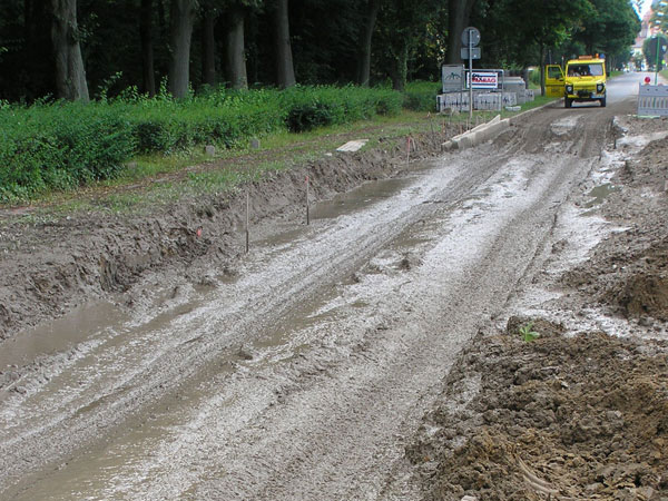 Bei den Arbeiten an der Bahnhofstraße kann man es z.Zt. wieder mal als einen Sprung nach vorn ansehen, dass seit etwas mehr als zwei Wochen (Montag 16.07) im Abschnitt Buchenallee - Parkstraße ausschließlich nur noch am Neuaufbau der Straße gearbeitet werden konnte. Bis dahin hatte nämlich die „optisch undankbare“ Verlegung des Abwasserkanals und vorher des Regenwasserkanals einen halben Monat den Eindruck vermittelt, als ob nichts passiere. Nur die im Verlaufe von mehreren Tagen Meter um Meter veränderte Position der Bagger zeigte unauffällig den Fortschritt an. Eine erneute Periode mit einigen Stark- oder Dauerregen erschwerte diese Arbeiten wiederum (Bild 6-2), ganz besonders auch dadurch, dass gerade in diesem Abschnitt viele lehmige Schichten durchgraben werden mussten. Auch wirkte unter diesen Umständen die große Tiefe des Regenwasserkanals an diesem Ende der Bahnhofstraße besonders verlangsamend.