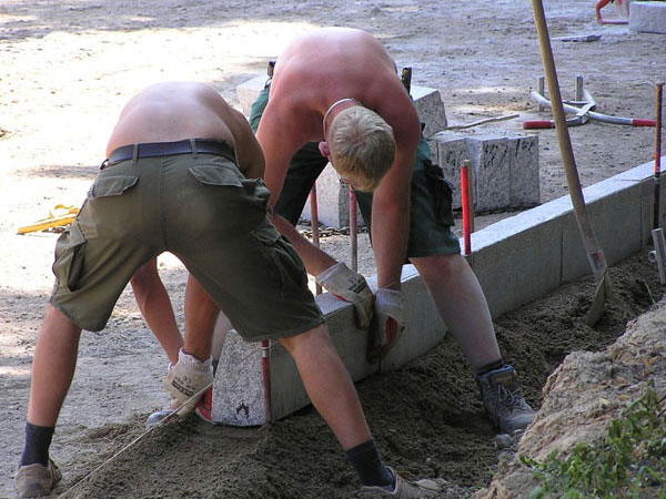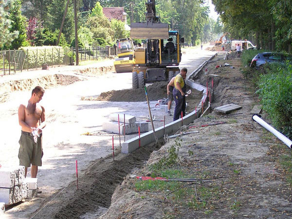Die Bordsteine sind auf beiden Straßenseiten in voller Länge gesetzt (Bild 6-4). Das Setzen dieser schweren Steine erfolgte hier eigenartigerweise mit Muskelkraft (Bild 6-5) und nicht wie im Abschnitt zum Bahnhof mit einem Kleinhebezeug. Jeder Stein wird zum Schluss auf dem vorher geschütteten Beton mit einem Gummihammer mit zuletzt vorsichtigen Schlägen in seine wasserwaagenüberprüfte Position gebracht (Bild 6-6). Im Verlauf der Bordsteinkantenlinie erkennt man die Ausbuchtung an einem der „Geschwindigkeitsdämpfer“, der „Insel“ am Ostende des Spielplatzes (Bild 6-7). Hoffentlich wird an ihnen nicht gespart. Eine genügende Zahl von ihnen wäre die einzige Möglichkeit der manchmal anscheinend zwanghaften Rennfahrermentalität der Pkw- und Kleintransporterfahrer einen spürbaren Riegel vorzuschieben.