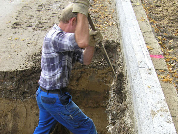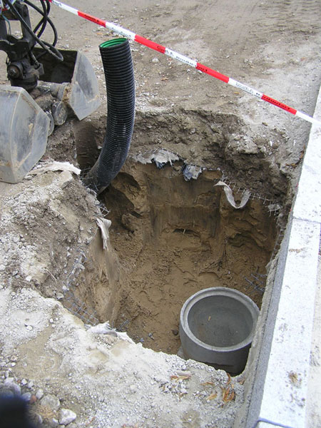 Die Schächte für die Regenwassereinläufe können erst nach den Bordsteinkanten gesetzt werden (Bild 6-8). Dazu muss die Frostschutzschicht wieder aufgebaggert und am Rande in schwerer Handarbeit aufgegraben werden (Bild 6-9).