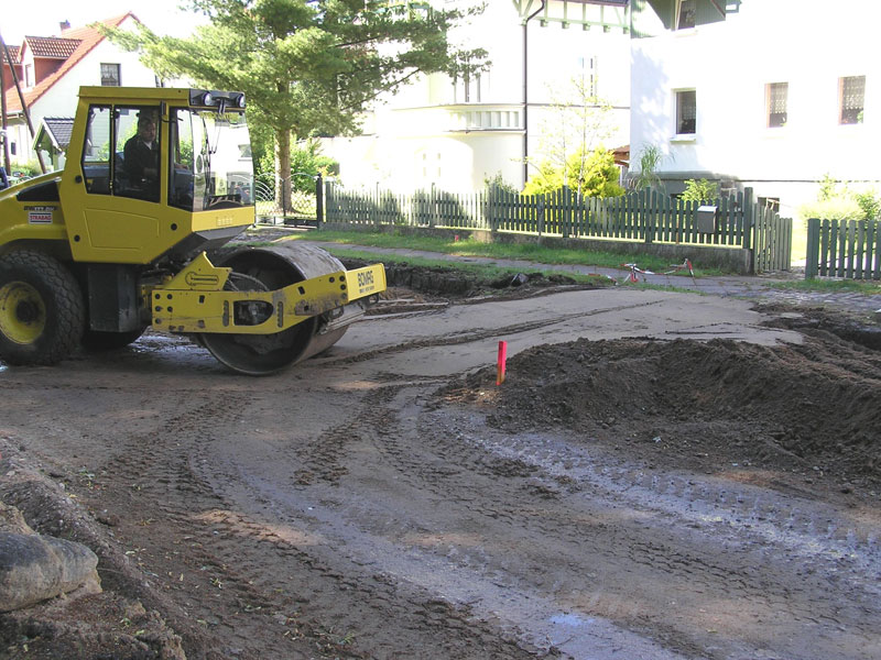 Sozusagen nach dem Motto: „verschiebe nicht auf morgen, was du heute kannst besorgen“ erfolgten die Arbeitsgänge Auskoffern und Aushub wegfahren, Isoliermatten legen sowie Schütten und Einwalzen der ersten Unterbauschicht zwischen Buchenallee und Steinstraße nicht systematisch von West nach Ost, sondern immer dort, wo gerade kein Graben für Rohre ausgebaggert wurde. Auch die streckenweise aufrechterhaltene halbseitige Befahrbarkeit trug zur notwendigen Unsystematik in den Arbeiten bei. Diese Arbeitsweise brachte auch zusätzlichen Aufwand mit sich, weil Zufahrtrampen von der bis zu 60-70 cm tief liegenden „Baugrubensohle“ zu den Grundstücken für einen Arbeitsgang entfernt und bis zum nächsten wieder angeschüttet werden müssen. Als Außenstehender gewinnt man aber den Eindruck, dass die Strabag-Leute versuchen, diese Beschwernisse für die Anlieger so erträglich wie möglich zu machen (Bild 6-11). Leider spielte Petrus in den vergangenen Wochen mehrmals nicht mit und weichte die Zufahrtstrecken der Anwohner unangenehm auf (Bild 6-12).