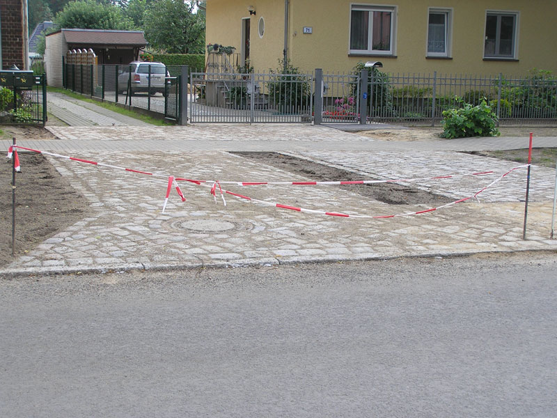 Östlich der Schubertstraße hat Fa. Brodmann in den letzten zwei Wochen mit einer anderen Truppe die Pflasterung der durch den Promenadenstreifen deutlich längeren Grundstückzufahrten auf der Südseite der Straße von der Aldi-Zufahrt im Osten bis zur Schubertstraße hergestellt (Bild 6-13). In der o.a. Bauausschusssitzung erläuterte Frau Secorsky, dass bei diesen Arbeiten individuelle Wünsche der Anlieger soweit irgendwie möglich berücksichtigt werden.