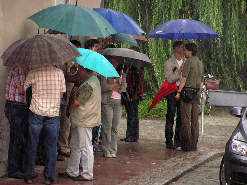 Eingeleitet und etwas verzögert wurde der Akt durch einen glücklicherweise nur kurzen, allerdings kräftigen Regenschauer, der die Beteiligten unter ihre Regenschirme zwang (Bild 2). Danach sprachen der Amtsdirektor, Herr Kühne, der Bürgermeister der Stadt Biesenthal, Herr Stahl, und der Seniorchef des bauausführenden Betriebes, Herr P. Jahn. Jeder von ihnen umriss einige der den Bauablauf verzögernden Schwierigkeiten und würdigte deren Bewältigung. Schwierige Bodenverhältnisse, verstärkt durch das lange Zeit regenreiche Wetter einerseits und zahlreiche Funde von Spuren der alten Bebauung und Straßenbefestigung im Zentrum der Stadt hatten immer wieder den Baufortschritt gehemmt.