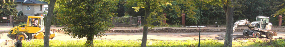 Nun können in den restlichen knapp zweihundert Metern des dritten Abschnittes (Steinstraße – Schubertstraße) der Sanierungsstrecke die restlichen Erdbauarbeiten (Auskoffern und Frostschutzschicht einbringen) und das Setzen der Bordsteine und der Regeneinlaufschächte erledigt werden. Fa.Brodmann arbeitet jetzt mit Hochdruck und hat auch schon den vergangenen Sonnabend (15.9.) drangegeben. Vielleicht muss auch der nächste noch dran glauben, denn in der nächsten Woche sollen nach Plan die Maschinen für den vollständigen Straßenaufbau wieder anrücken.