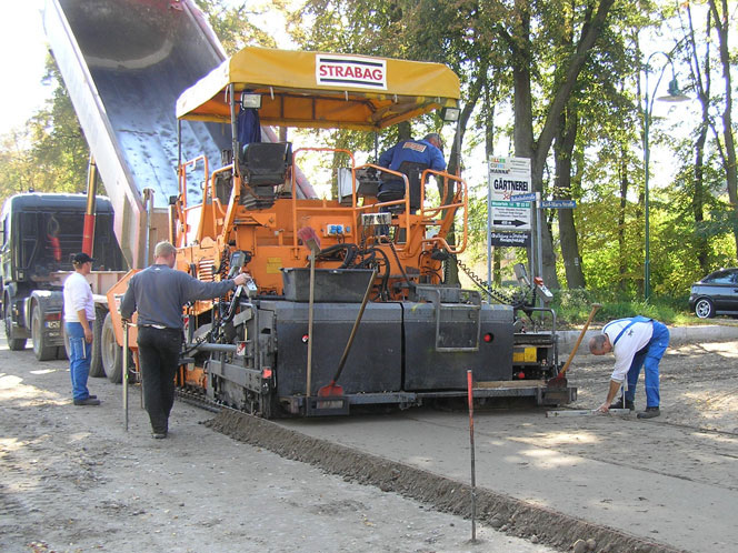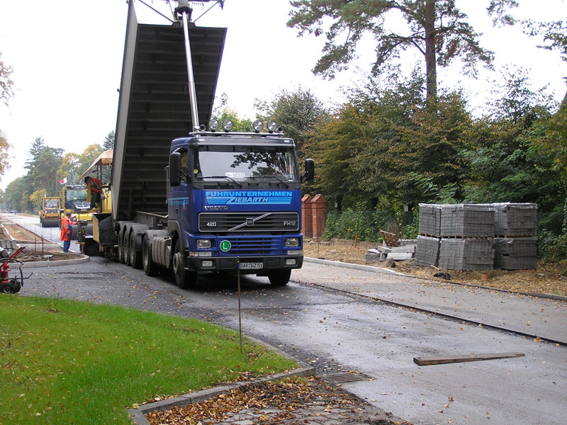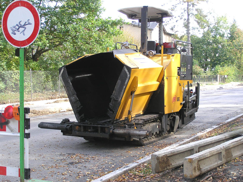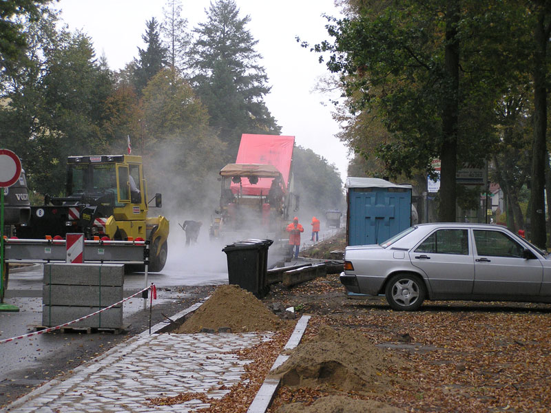 Für die sonst oft von Überstunden geplagten Männer nahte also ein ungewollt früher Beginn des Wochenendes, leider erst mal verbunden mit dem schalen Gefühl, den „Kampftermin“ des 30.09. wegen des Versagens der Technik verpasst zu haben1). Offensichtlich waren aber alle Beteiligten bei Strabag daran interessiert, die Unterbrechung so kurz wie möglich zu halten. Und so wurde noch am Wochenende eine kleine Ersatzmaschine für das Auftragen der restlichen „Asphalt“-Flächen in den Trompeten der Karl-Marx-Straße, der Steinstraße und der Kiefernallee nach hier transportiert (Bild 11-9), sodass diese Arbeiten schon gestern, Montag den 1. Oktober in der Mitte des Vormittags erledigt waren.