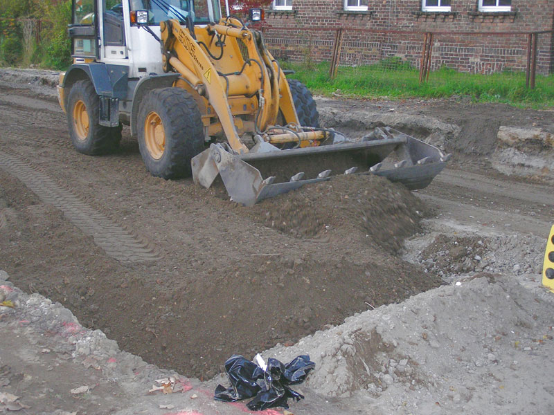 Nachdem gestern schon ein wegen seiner Verlegeart nicht durch ein Warnband angezeigtes und dazu noch außerordentlich flach liegendes Telefonkabel ärgerliche Schwierigkeiten gemacht hatte, verzögerte sich heute Vormittag stellenweise die Auskofferung wegen weiter zu erwartender Kabel durch vorsichtige „Millimeterarbeit“. Und tatsächlich kam ein nur 40 cm unter Geländeoberfläche liegendes und auf reichlich 5 m mit seiner Richtung aus der Spur geratenes dickes Kabel zum Vorschein. In diesem Bereich musste Mario Schilling seine Schalthebel und die Maschine verlassen und wie früher zur Handschippe greifen (Bild 12-4).