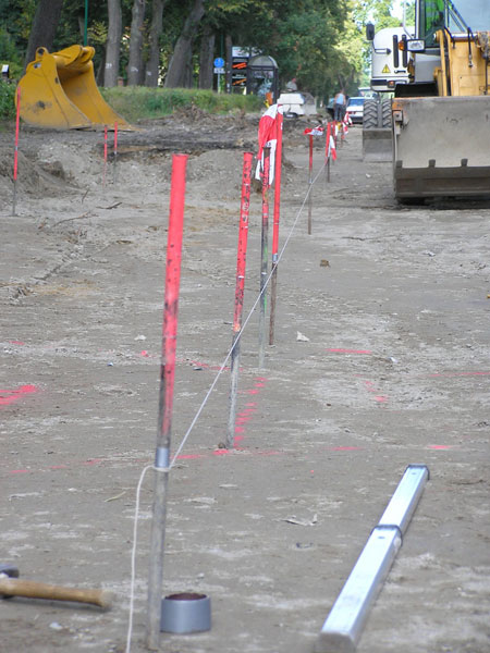 So können beide noch in dieser Woche die Schnüre für Fluchten und Höhen einmessen und spannen, die für das Nadelöhr im Bauablauf, das Setzen der Bordsteine (Firma Brodmann, Biesenthal), unerlässlich sind. Diese Schnüre werden in einem Stadium des Bauablaufs gesetzt, in dem die Baustelle noch einen sehr rohen Eindruck macht (Bild 12-8, aus früherem Bauabschnitt). Und trotzdem entscheiden sie indirekt, durch ihre Bestimmung des Oberkantenverlaufs der Bordsteine, schon in diesem frühen Stadium über das richtige Auf und Ab der Schottertragschicht und der Asphaltschichten zwischen den Regenwassereinläufen der fertigen Straße, landläufig „Gullys“ genannt und damit über die einwandfreie Entwässerung der Straßenoberfläche bei Starkregen. Ihre richtige Einmessung ist also eine der Künste des Straßenbaues und seiner Ingenieure und ihrer Helfer.