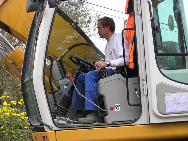 Die Pflasteraufnahme dieser letzten kleinen Fläche von max. 50 m2 stellte an den Mann in der Kabine wirklich hohe Anforderungen an sein Feingefühl im Umgang mit der Maschine: die Platzverhältnisse für die Aufstellung von Bagger und Lkw waren beengt, sodass mit der Baggerschaufel für Zugreifen und Abkippen jedes Mal ein 180°-Schwenk unter beängstigend schwierigen Bedingungen vollführt werden musste: zwei ziemlich tief hängende Leitungen im Schwenkbereich des Baggers verhinderten den gewohnten zügigen Umgang mit diesem schweren Gerät. Statt dessen mussten Arm und Schaufel des Baggers beim Hin-und beim Rückweg jedes Mal in einer ganz bestimmten angewinkelten Haltung cm-genau unter den ca. 5 m nebeneinander verlaufenden Kabeln hindurch geführt werden – und das viele, leider nicht gezählte Male. Die Bilder 13-7 bis 13-10 sollen einen Eindruck von diesem Zittervormittag vermitteln.