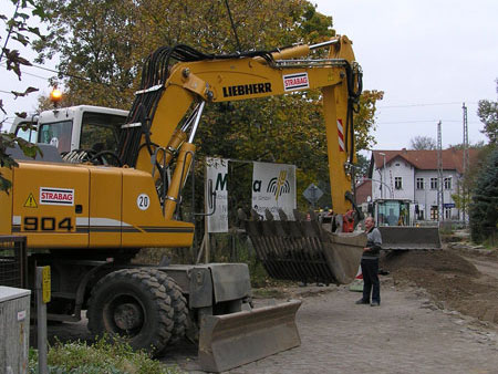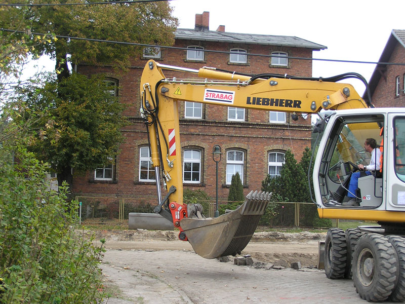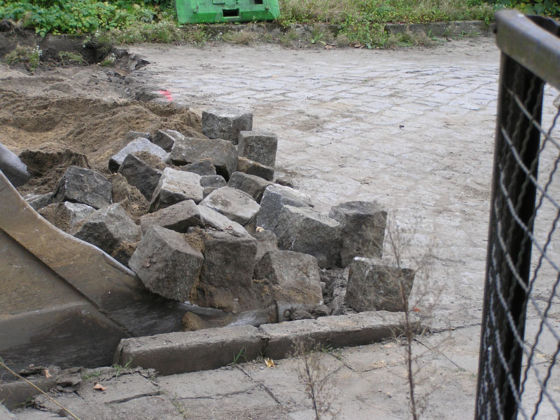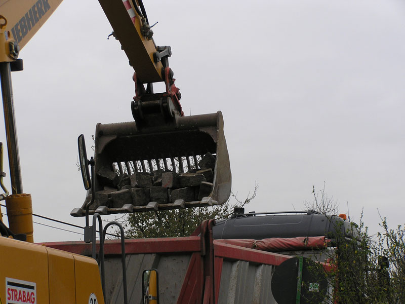 Heute, Donnerstag den 11. Oktober 2007 wurde bei den Arbeiten zur Sanierung der Bahnhofstraße Biesenthal zwischen 11:50 Uhr und 11:55 Uhr die letzte Baggerschaufel Pflastersteine vom heute als Baggerführer arbeitenden Mario Schilling der Erdbaumannschaft von Strabag (Bild 13-1) aus ihrem Bett gehoben (Bild 13-2), ausgesiebt (Bild 13-3 von vorhergehendem Arbeitsgang) und, nachdem die letzten Steine von Hand dazu geworfen waren (Bild 13-4), auf dem Lkw der Firma Korduan mit Max am Steuer abgekippt (Bild 13-5 und 13-6).