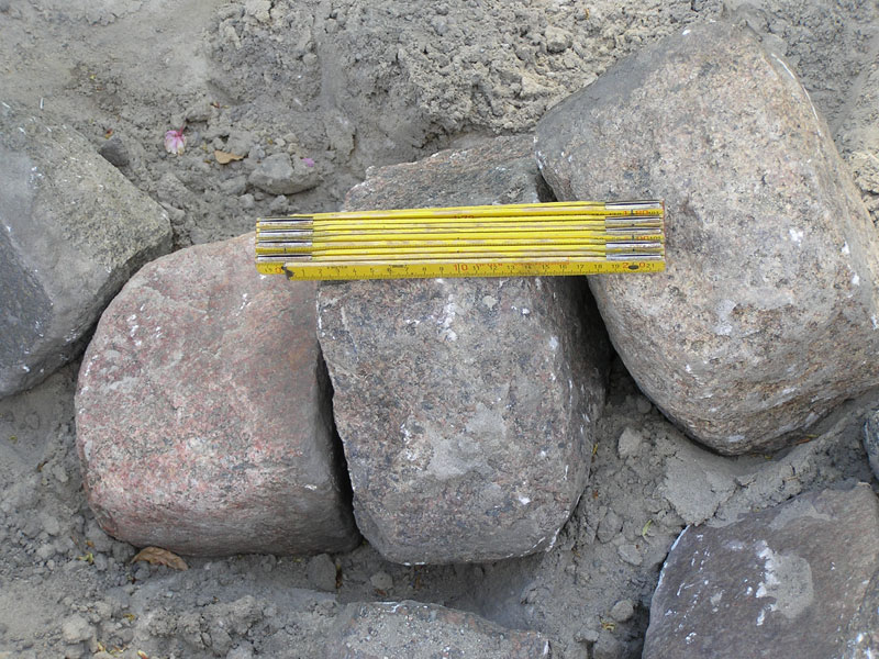 Eine interessante Besonderheit aber stellte das Pflaster der knapp 800 m zwischen der Steinstraße und dem Weg „Melchower Feld“ gegenüber dem Stadtpark dar. Es zeichnete sich im Gegensatz zu den übrigen Abschnitten durch eine auffallende Vielfalt der Gesteine aus, die diesem Abschnitt besonders bei nassem Wetter ein interessantes Aussehen verlieh (Bild 4). Hier brachte die „Demontage“ des Pflasters aber Pflastersteinformen zu Tage, die denen der übrigen Abschnitte fehlten. Zwar war ihr „Kopf“ etwa normgerecht rechteckig oder quadratisch geschlagen, aber einzelne Seiten der Steinkörper waren oft sehr unregelmäßig behauen und hatten schiefe Flächen. Vor allem aber waren bei vielen Exemplaren einzelne Kanten und/oder die sechste, untere Seite überhaupt nicht geschlagen, sondern hatten die runde Form eines Feldsteines (Bilder 5 und 6). Aus den beschriebenen Eigenschaften (Formen und Gesteinsvielfalt) dieses Pflasters leite ich die Annahme ab, dass die teilformatierten Pflastersteine der genannten 800 Meter wirklich märkischer Herkunft waren: in der zweiten Hälfte des 19.Jahrhunderts bis in das 20. hinein bestand nämlich im Gebiet Althüttendorf - Joachimsthal eine Pflastersteinindustrie, die die dortige „Blockpackung“ – eine eiszeitliche Anhäufung von Steinen aller Größen – als „Rohstoff“ benutzte. Die Verwendung diese Materials in der Bahnhofstraße ist insofern eine Besonderheit, als um 1910, dem wahrscheinlichen Zeitraum der Pflasterung dieser Straße, die Blütezeit der Althüttendorfer Pflastersteinherstellung schon überschritten war und Massenimport von Großsteinpflaster aus Skandinavien vorgeherrscht hat. Diese in der Bahnhofstraße verwendeten Steine könnten auch schon damals wiederverwendetes Material gewesen sein, das bei der „Umpflasterung“ einer Straße in einem anderen Ort angefallen war. Leider gibt es im Stadtarchiv keine Dokumente, die die damalige Materialbeschaffung (Aufträge, Rechnungen u.ä.) belegen.