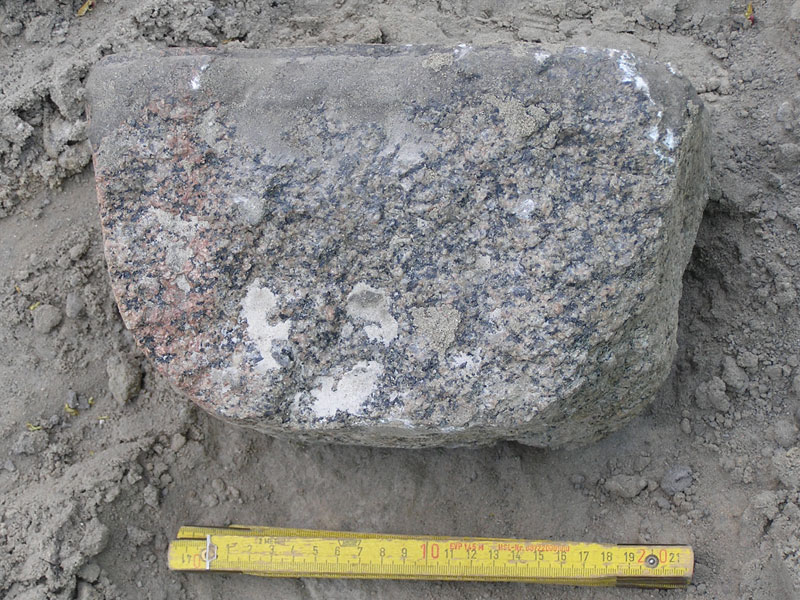 Aber wo waren solche Steinbrüche? Das sieht man den Gesteinen nicht ohne weiteres an. Zwei von ihnen, die in der Hauptbahn des Biesenthaler Pflasterdenkmals an das Pflaster der Bahnhofstraße erinnern sollen, kamen möglicherweise ebenfalls aus Skandinavien zu uns. Es sind zwei Arten von Gneis. Das sind Gesteine, die in ihrem jetzigen Zustand bei höheren Temperaturen und z.T. auch höheren Drücken aus einfacheren Gesteinen entstanden sind (Bilder 1 und 2). Wenn die Vermutung über ihre Herkunft zutrifft, sind sie aber nicht vor Tausenden von Jahren als „Ladung“ des Eiszeiteises, sondern vor 100 bis 150 Jahren als Ladung oder Ballast des Frachtschiffverkehrs zwischen Skandinavien, speziell Schweden und Deutschland, über Ostseehäfen hierher gekommen. Um diese Zeit wurde der massenhafte und zunehmende Bedarf an Pflastersteinen für den Boom des Pflasterns norddeutscher Stadtstraßen und Berlins preiswert durch Seeweg-Import von dort gedeckt. Für die Pflastersteinherstellung geeignete Gesteine kommen dort direkt an der Küste vor. Auf reichlich 200 m Länge enthielt das Pflaster der Bahnhofstraße auch einen ganz unspektakulären Granit, vermutlich aus Schlesien (Bild 3).