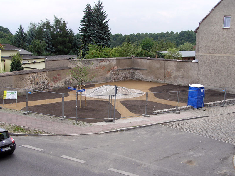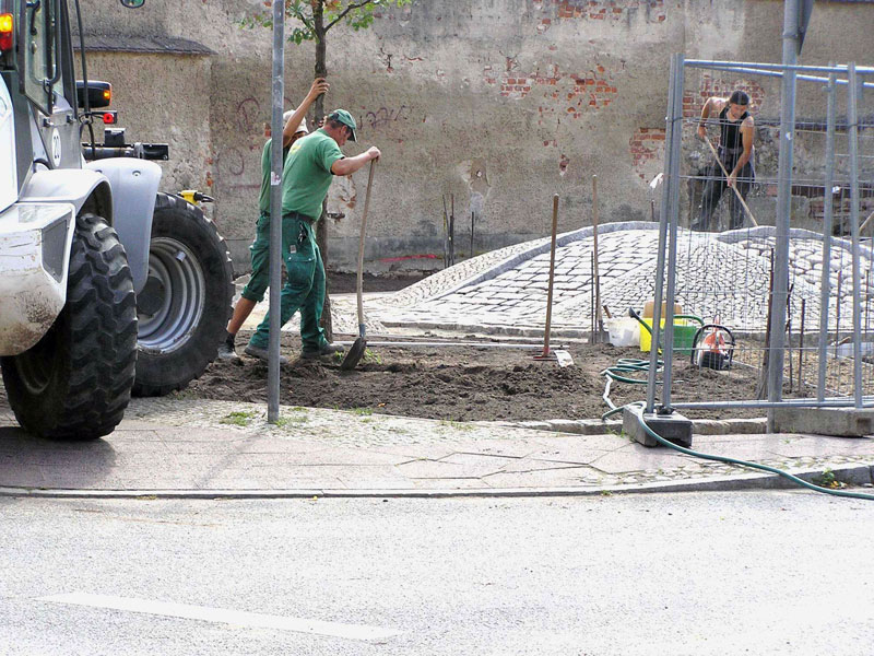 Bis Sonntag den 3. August 2008 sah die Ecke August-Bebel-Straße/Grünstraße noch so aus, wie sie 26 Jahre lang ausgesehen hat (Bild 1). Einen Tag später aber, vor rund vier Wochen, rückte schweres Gerät der Firma Märkisch Grün an, um mit dem Planieren zu beginnen und einen weiteren Tag später, am Dienstag 5. August, war alles umgewühlt und schon viel von den Schuttresten der alten Gebäude abgefahren (Bild 2). Unerwartete Verhältnisse an einigen Stellen der Fläche benötigten zwar zusätzliche Entscheidungen über die weitere Verfahrensweise. Diese konnten aber trotz Urlaubszeit schnell herbeigeführt werden, sodass die Arbeiten schon ab Freitag 8.August weitergingen. An den drei Teilaufgaben – Umgestaltung der Fläche, Bau des Pflasterdenkmals und Bau einer niedrigen Feldsteinmauer als teilweise Begrenzung zur Grünstraße - wurde so viel wie möglich gleichzeitig gearbeitet. Allerdings musste für die Arbeiten am Pflasterdenkmal noch längere Zeit genügend Platz für die Zufahrt des ungefügen Schaufelladers frei gehalten werden. Am 20.8. aber waren die Pflastersteine durch zwei von Märkisch Grün „angeheuerte“ Spezialisten aus der Gilde der Steinsetzer oder Pflasterer weitgehend gesetzt, nur die Verfugung fehlte noch (Bild 3).