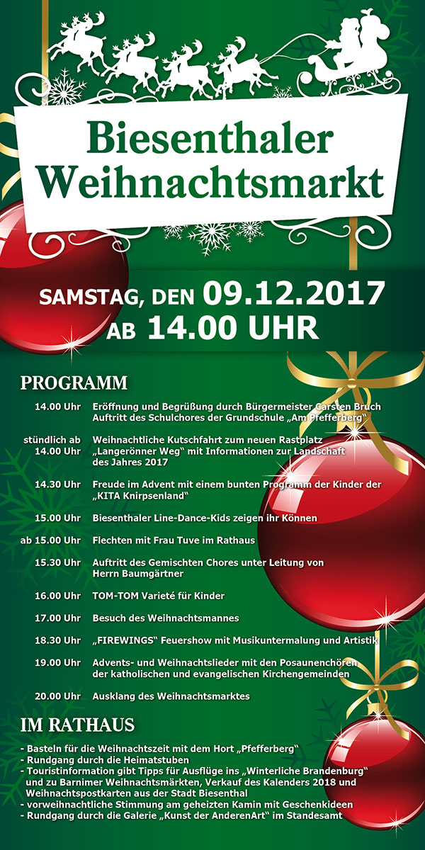 Am zweiten Adventswochenende verwandeln sich der Biesenthaler Marktplatz und das Rathaus in stimmungsvolle Orte zur Vorweihnachtszeit. Festliche Klänge und weihnachtliche Häuschen laden zum Verweilen ein und begeistern die kleinen und großen Besucher. Genießen Sie bei Ihrem Rundgang in gemütlicher und familiärer Atmosphäre, den Duft von gebrannten Mandeln, kandierten Früchten, Waffeln, heißer Schokolade oder Glühwein. Herzhaftes und süße Speisen werden Sie ebenso an den weihnachtlichen Ständen finden.