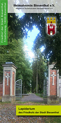In der Folge wurden Frau Poppe und der Heimatverein nach Vorschlägen würdiger Bürger und deren Grabmalen befragt. Das Ergebnis ist die zu besichtigende Auswahl – wohl wissend, dass weitere Erwähnungen möglich wären und uns zahlreiche Informationen nur bruchstückhaft vorliegen. Dennoch hoffen wir, allen Interessierten einen Einblick in die Biesenthaler Friedhofskultur zu geben. Das Lapidarium wird mit Sicherheit in den kommenden Jahren ergänzt werden, Steine werden umgesetzt und weitere Restaurierungen vorgenommen. In Kürze erfolgt die Aufstellung einer Informationsstele an den Steinen des Lapidariums, um auch am Ort Informationen bereitzustellen.