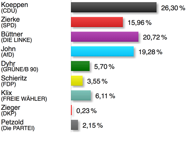 Der im Wahlkreis 57 erfolgreiche Direktkandidat Jens Koeppen (CDU) erhielt auch in Biesenthal die meisten Erststimmen (26,3 %), Andreas Büttner (DIE LINKE) kam auf 20,7 % vor Steffen John (AfD) mit 19,3 %. Detlef Klix (Freie Wähler) konnte den Heimvorteil für einen Achtungserfolg (6,1 %) nutzen. Ausführliche Statistiken und Grafiken zu den vorläufigen Endergebnissen auf kommunaler Ebene stellt das Amt Biesenthal-Barnim zur Verfügung. lb mehr...